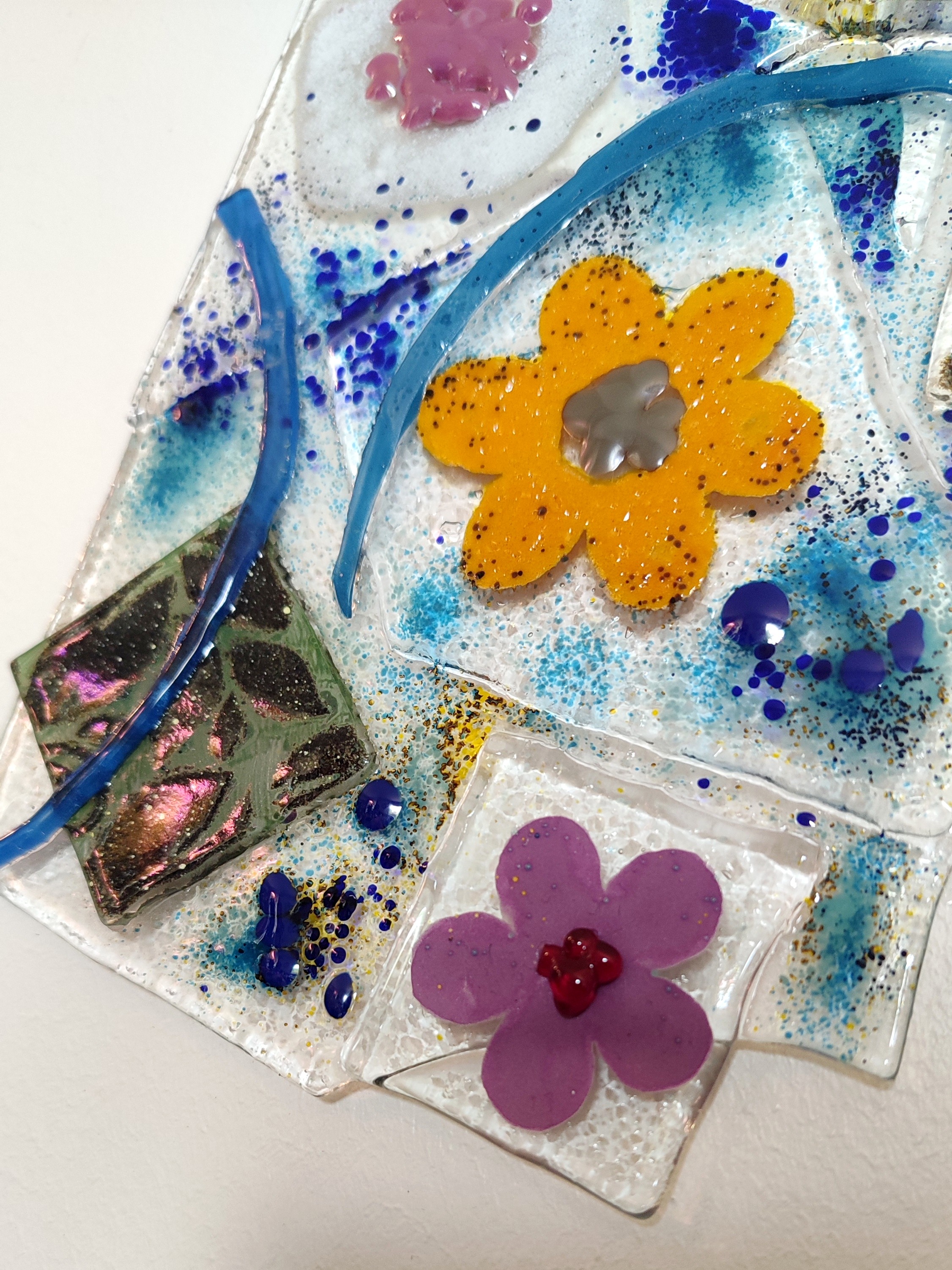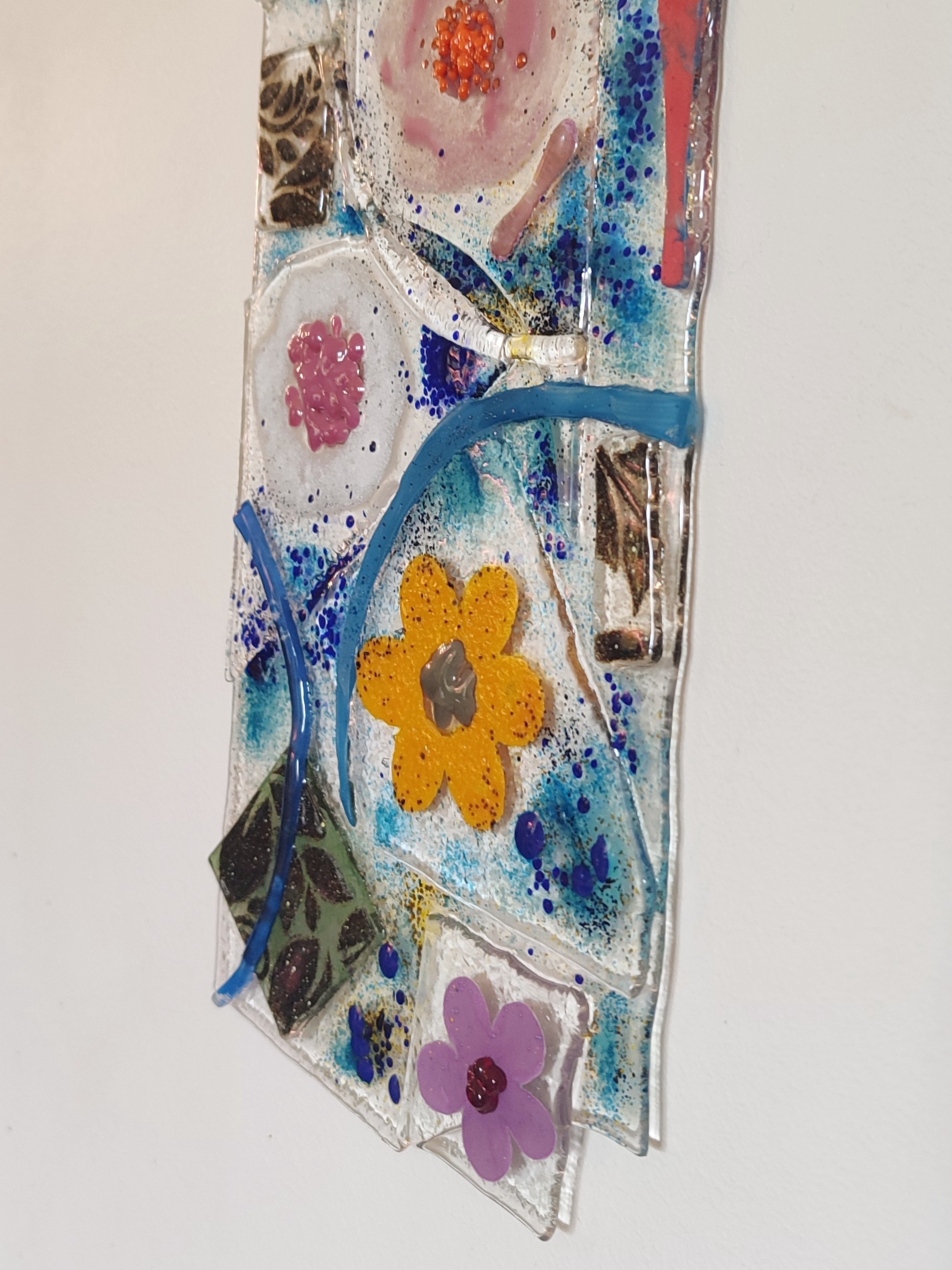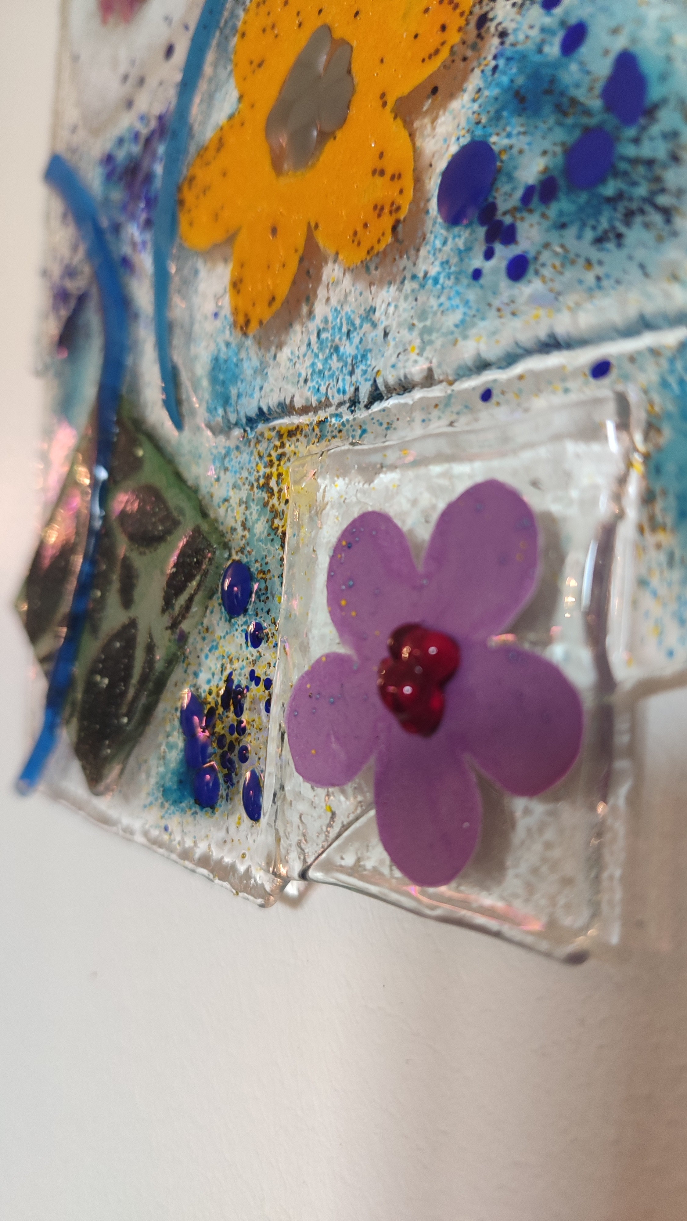 Cette décoration murale est unique, réalisée en verre fusionné. Pour la réaliser, j'ai utilisé différentes techniques, différents verres.