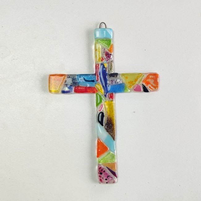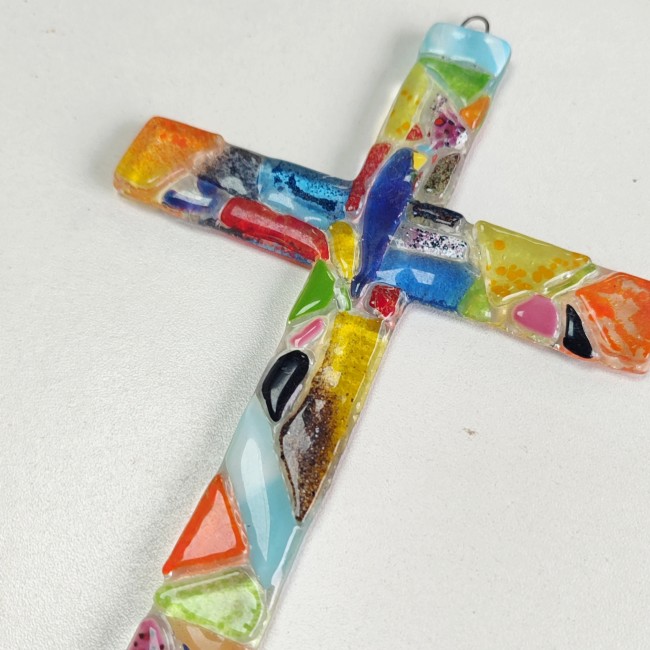 Cette croix est réalisée avec plusieurs couches de verres de différentes couleurs, du jaune, du bleu, du gris, du rouge, du vert...