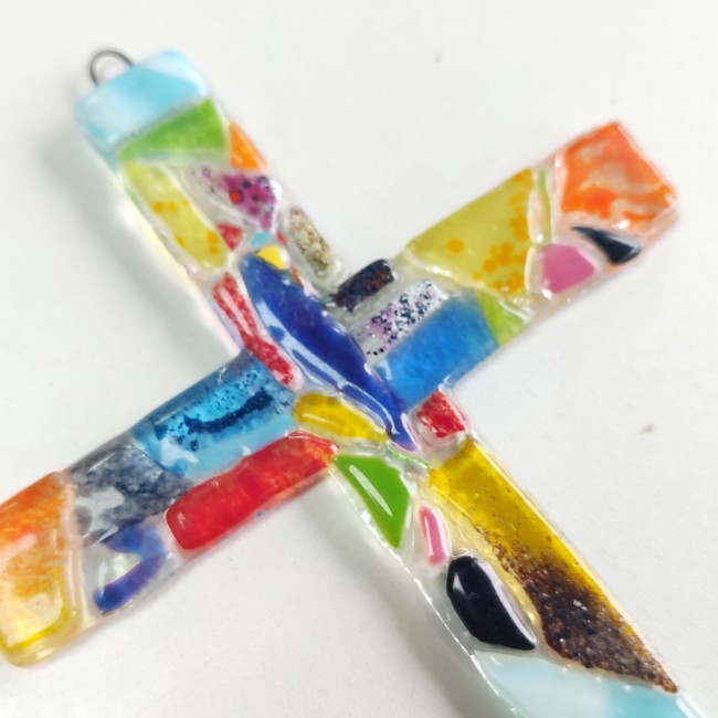 La croix reçue est aléatoire, mais toujours dans le même esprit, une base transparente avec du verre coloré.