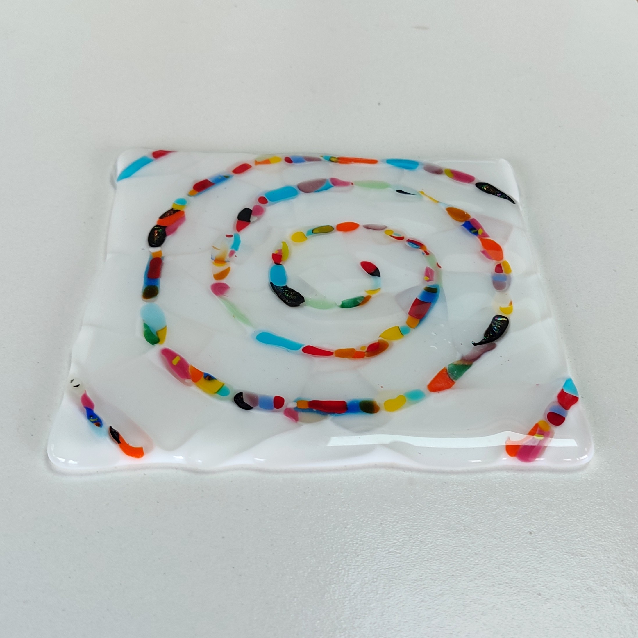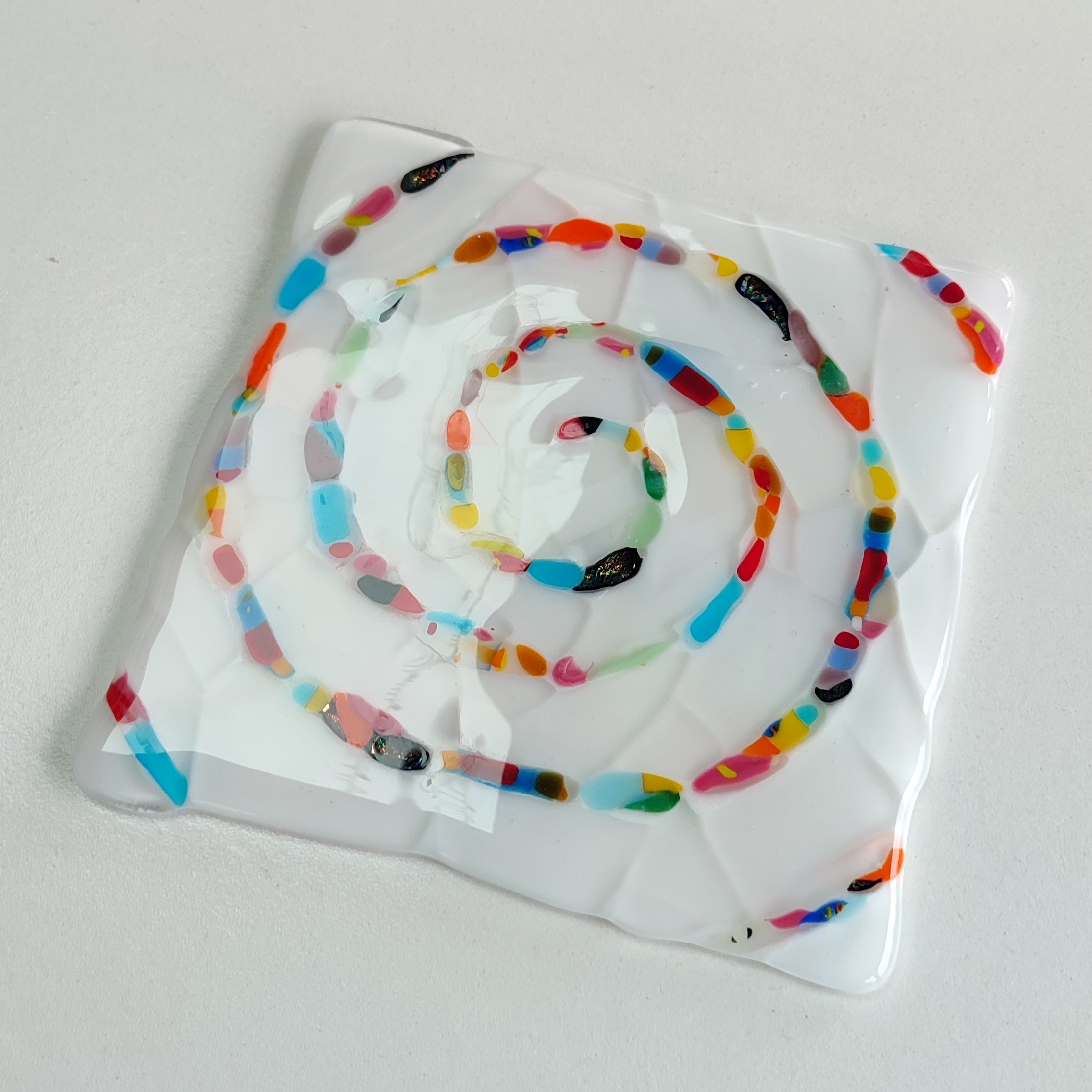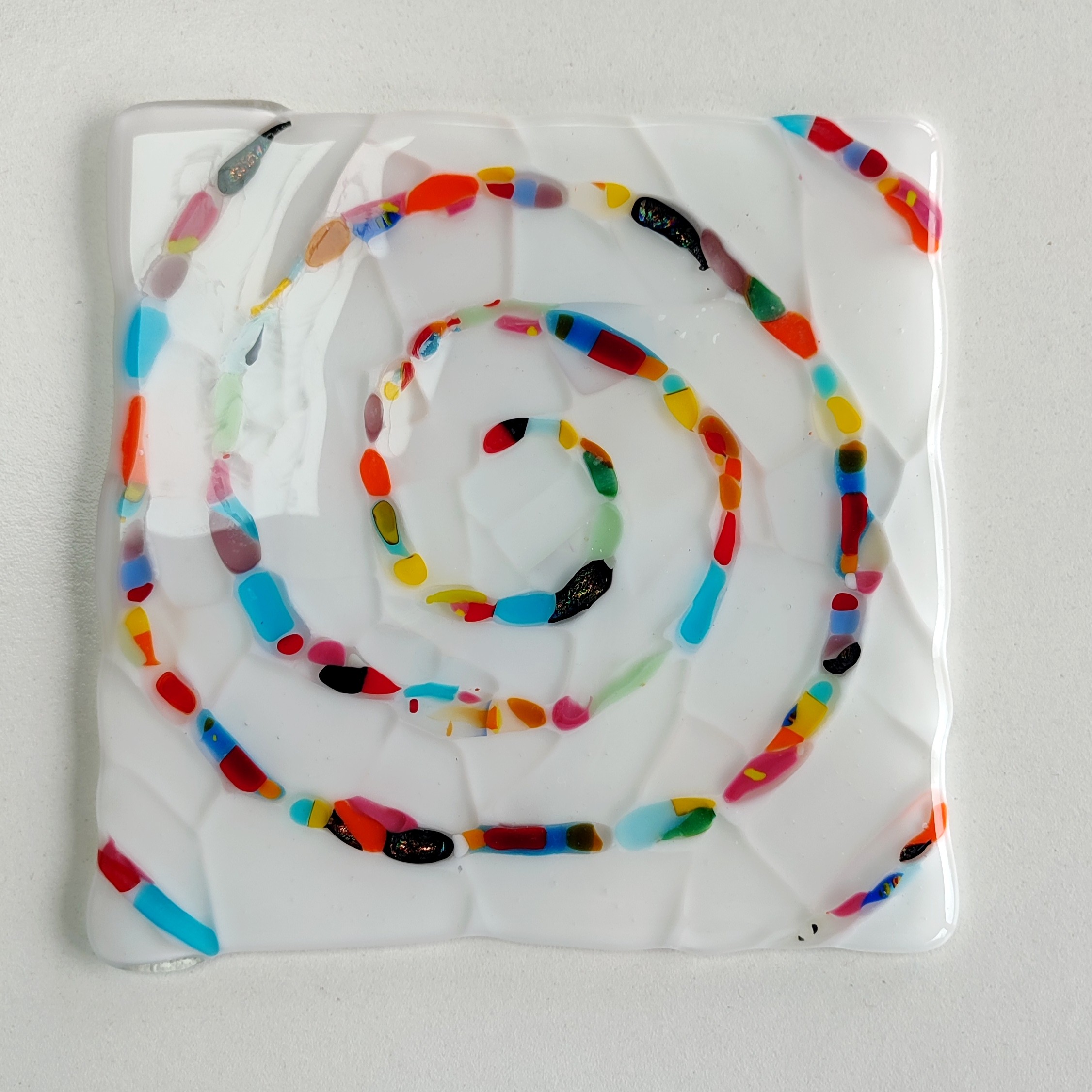 Le dessous de plat est composé d'une base blanche avec des incrustations de verres de différentes couleurs. Ce dessous de plat représente un tourbillon multicolore.