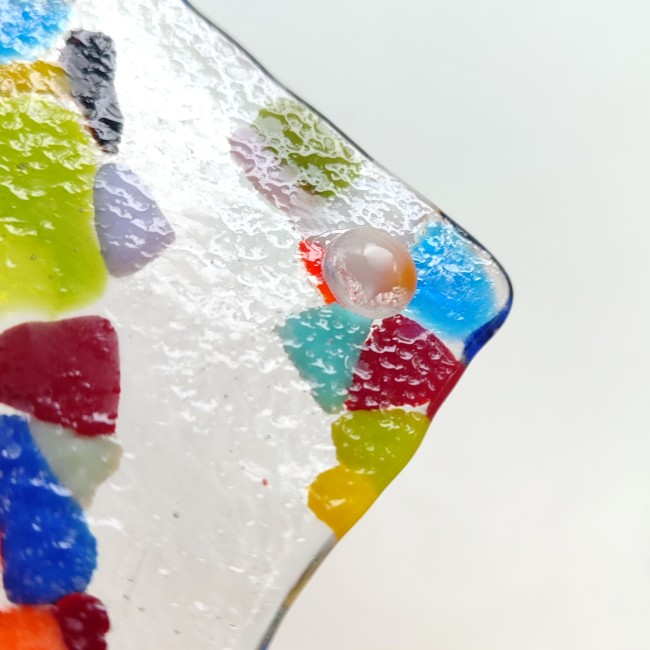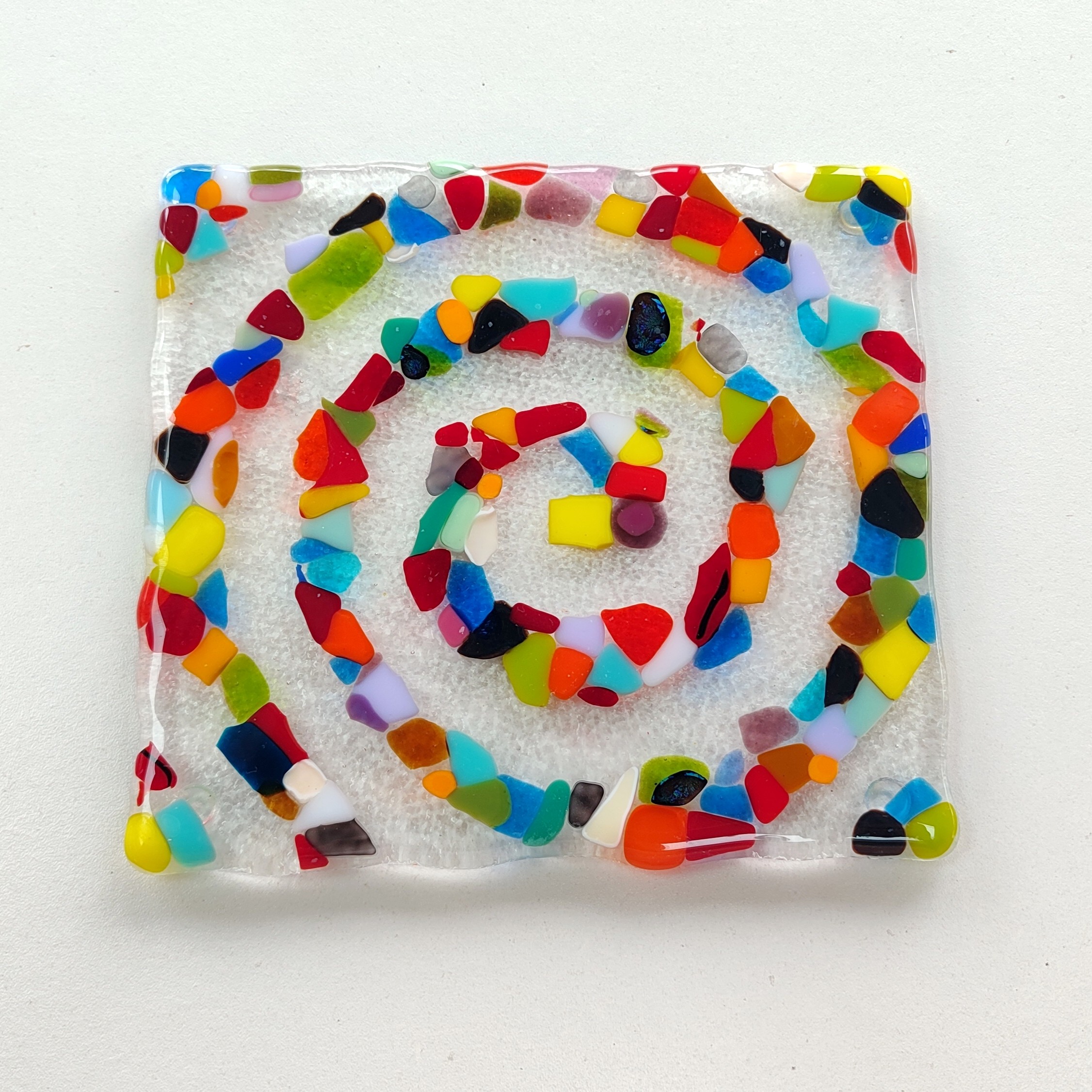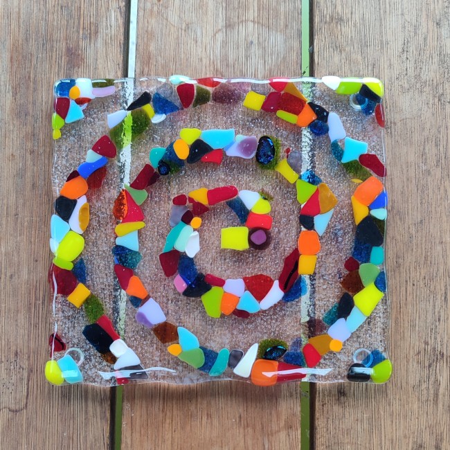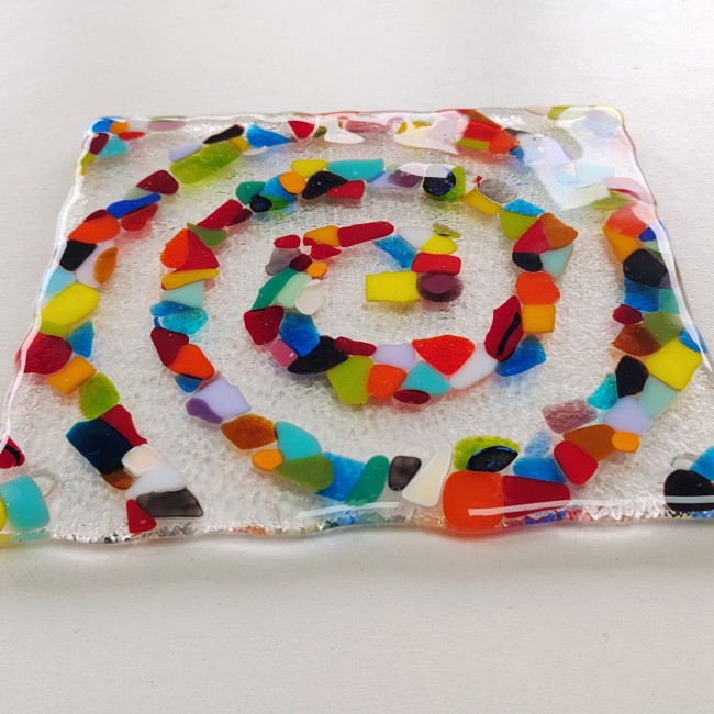 Le dessous de plat est composé d'une base transparente avec des incrustations de verres de différentes couleurs. Ce dessous de plat représente un tourbillon multicolore.