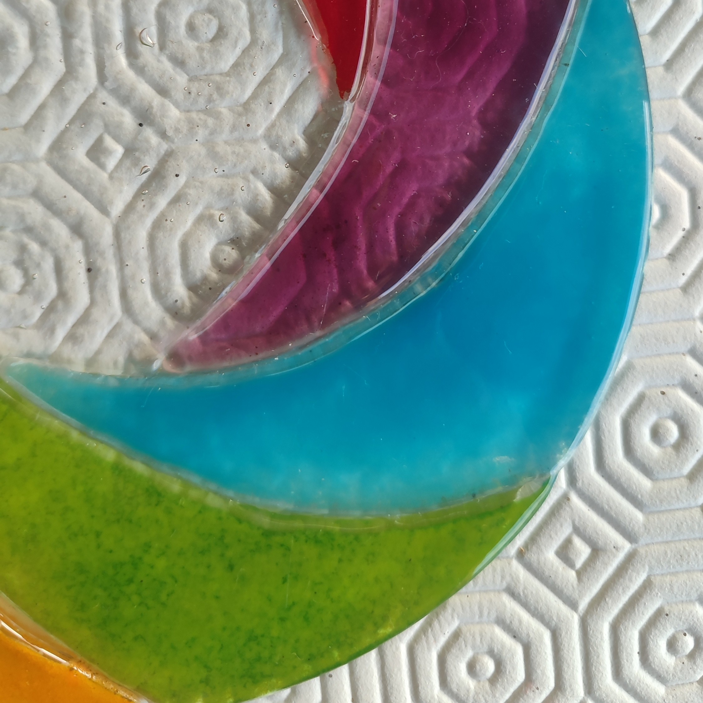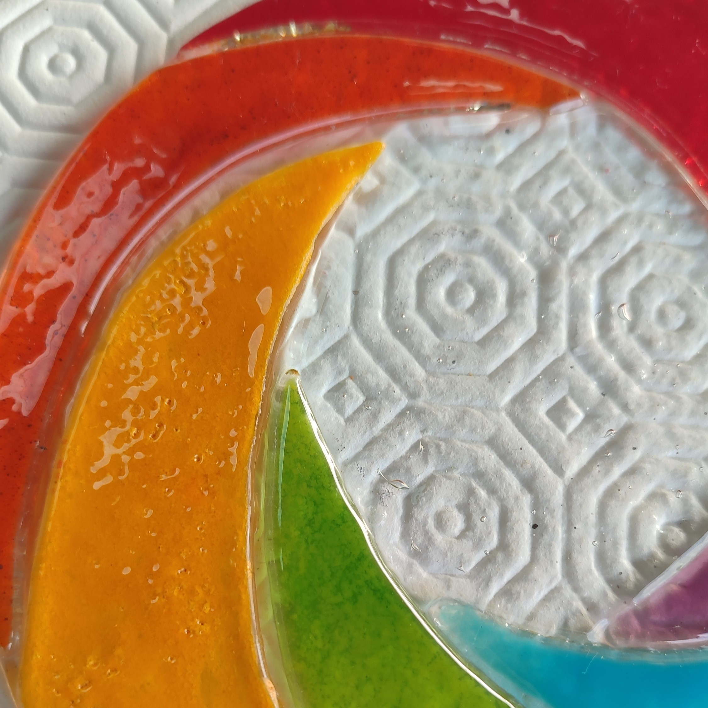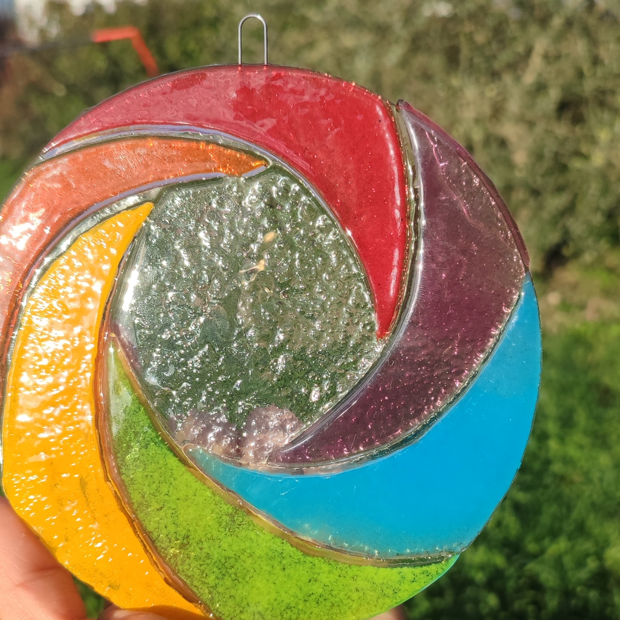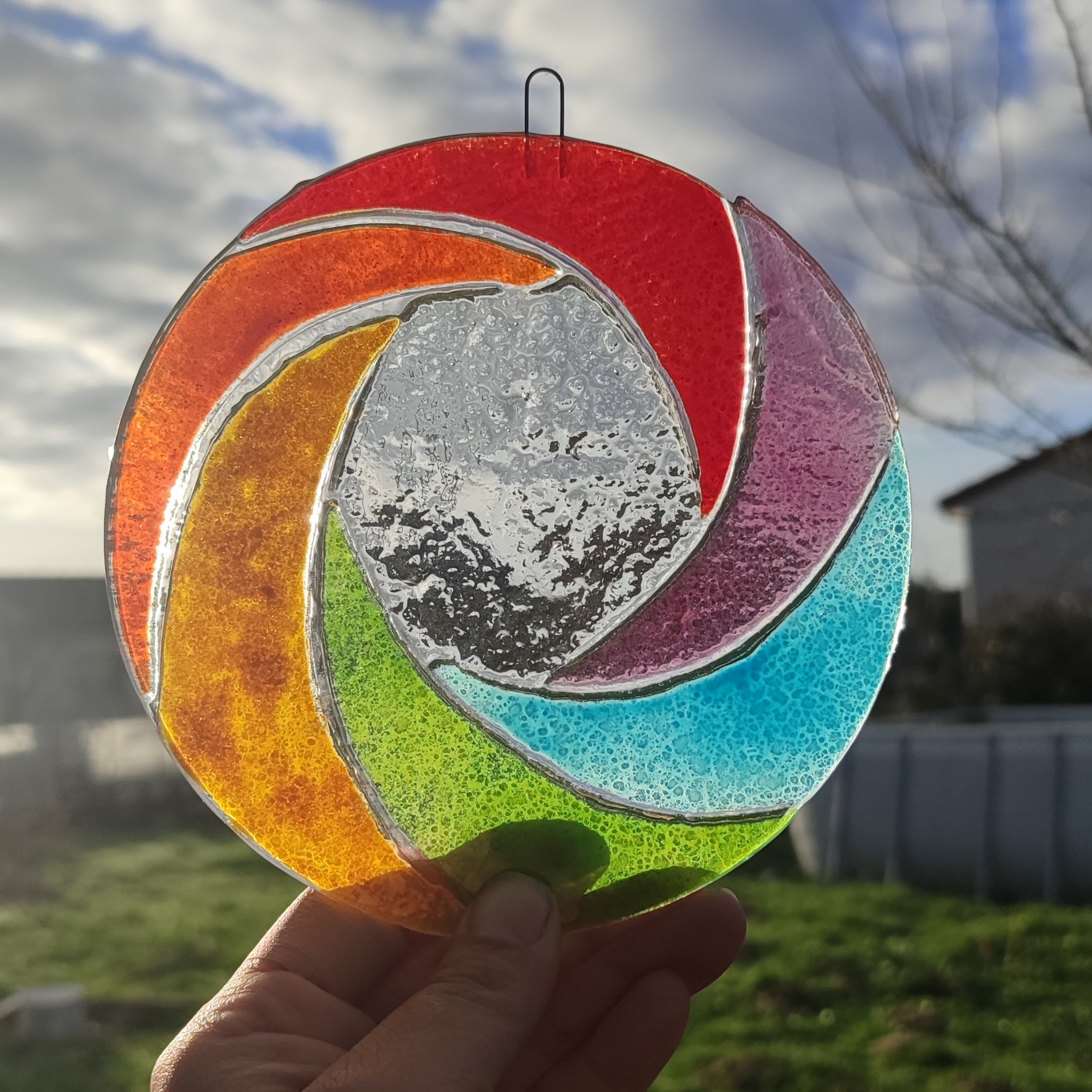 Cet attrape- soleil est réalisé en verre fusionné, il représente une spirale multicolore. Une attache est emprisonné dans le verre durant la cuisson.
