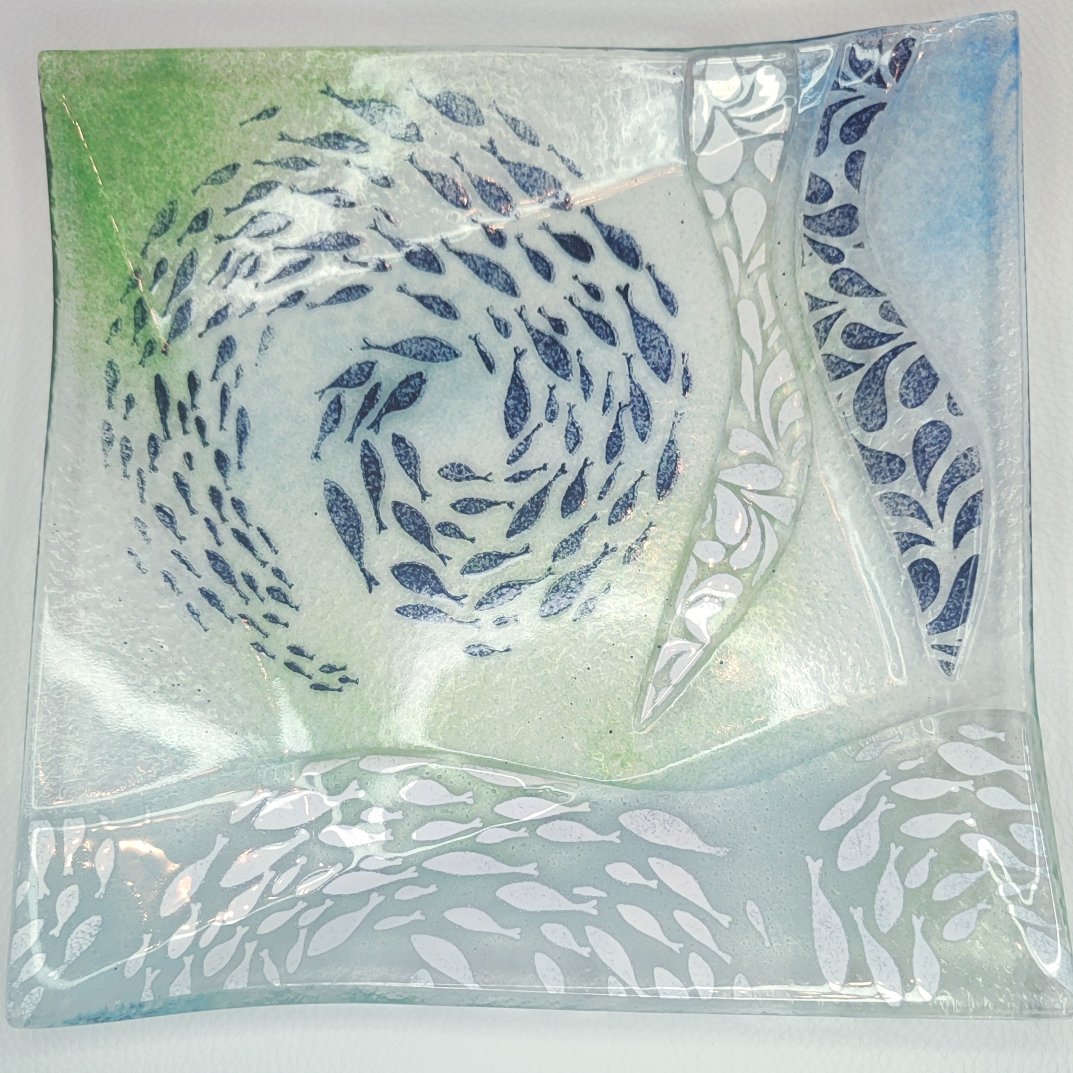 J'ai utilisé pour ce plat des couleurs dans un esprit marin, du bleu, du vert turquoise, du blanc et du noir. Le thème est la mer avec ses bancs de poissons.
