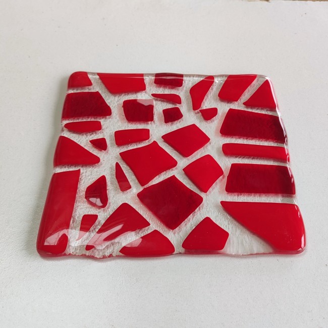 Le dessous de plat est composé d'une base transparente avec de nombreuses incrustations colorées.