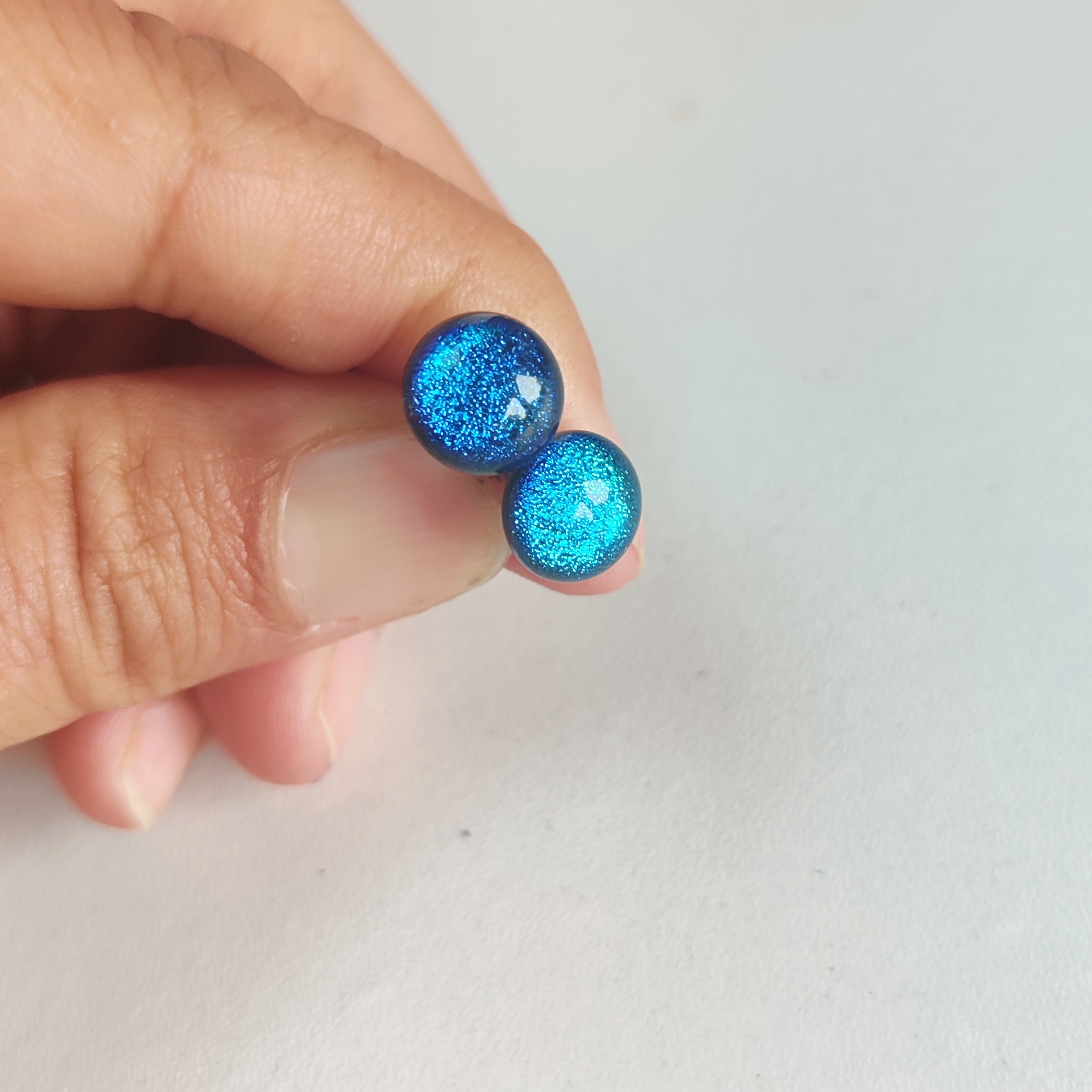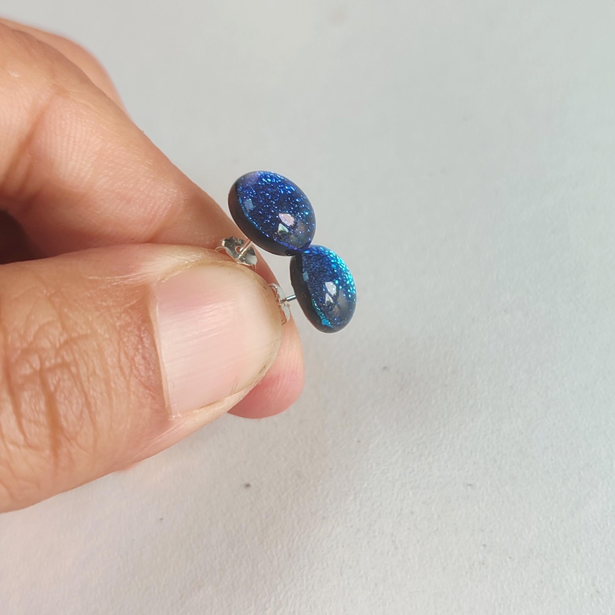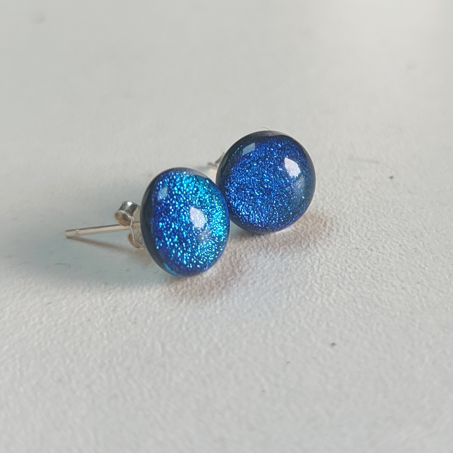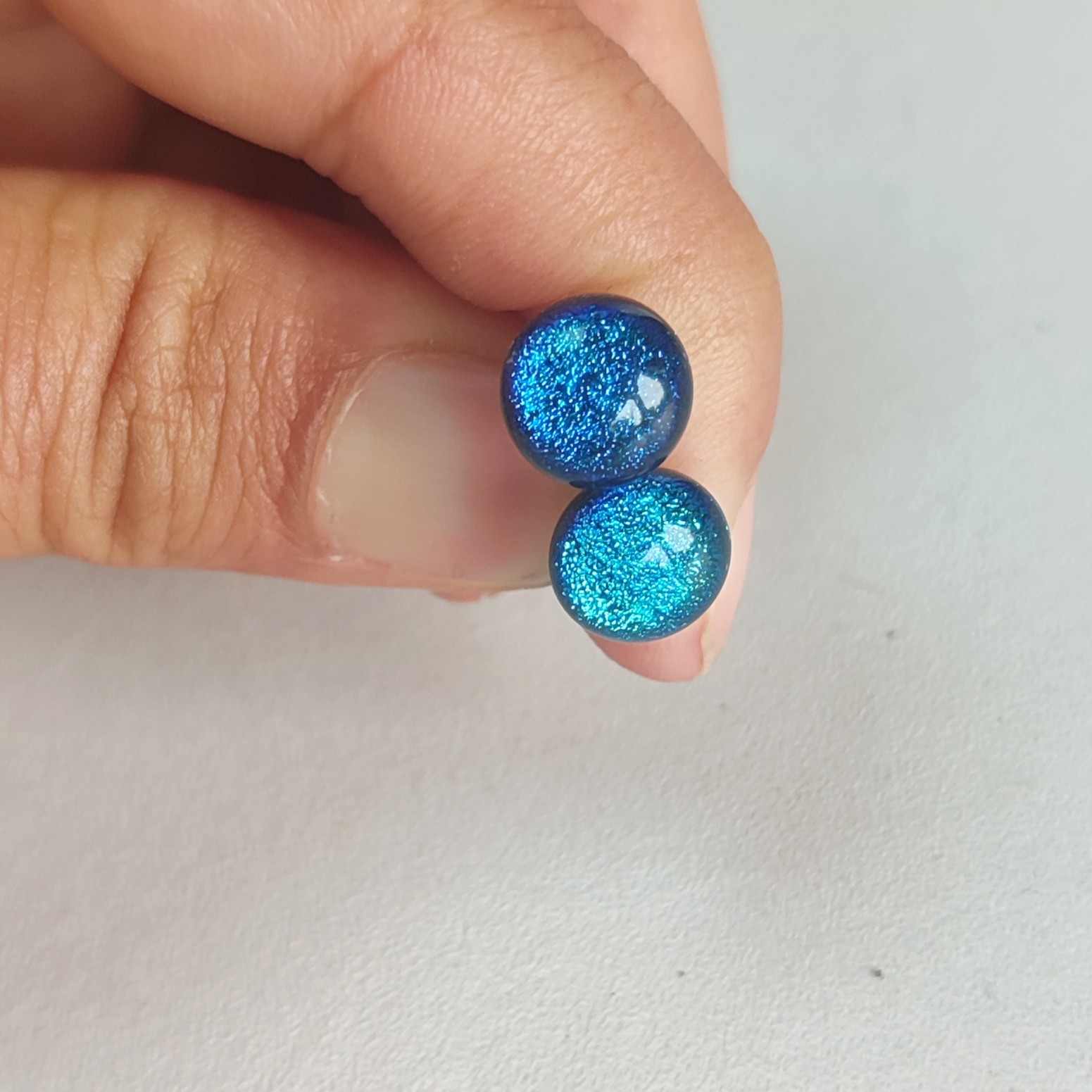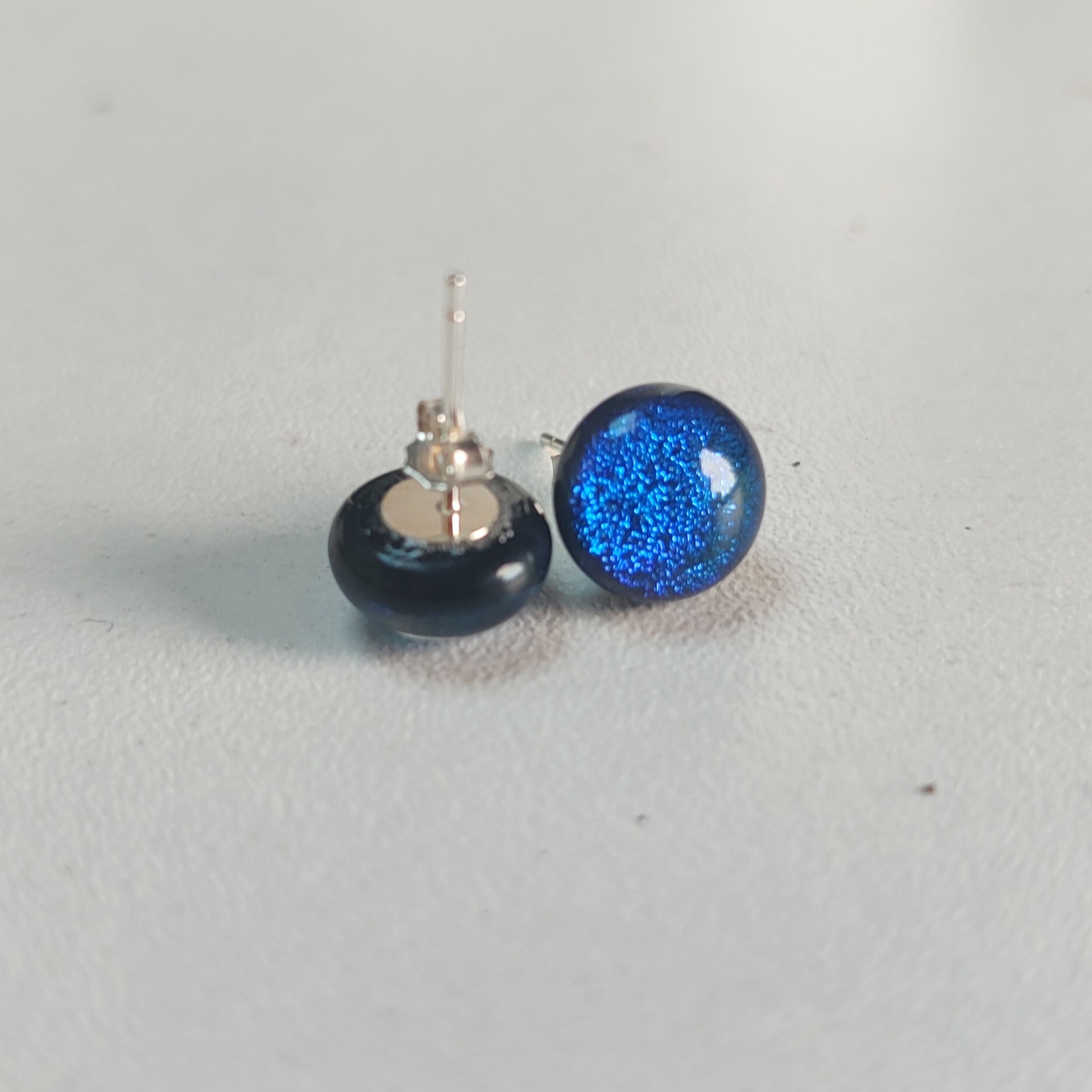 ces puces sont réalisées en verre fusionné. Pour les réaliser j'ai utilisé un verre dichroïque magnifique avec de nombreux reflets bleus. La forme est ronde. La couleur des puces d'oreilles est bleue avec différents bleus, les puces sont réalisées avec le même verre mais on des teintes légèrement différentes, c'est ce qui fait la magie du verre et de l'artisanat.
