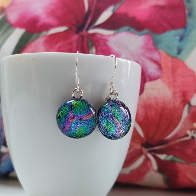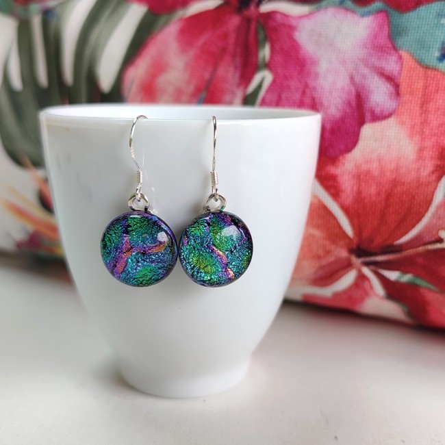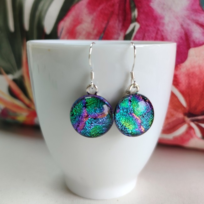 La paire de boucle d'oreilles est composé d'un cabochon artisanal que j'ai réalisé en verre fusionné, il est sur fond noir avec des couleurs dichroïques " écailles de sirène". Ces boucles d'oreilles sont magnifiques, elles ont de nombreux reflets. Pour réaliser ces boucles d'oreilles j'utilise un verre dichroïque magnifique. A la lueur du jour, leur luminosité vous surprendra.