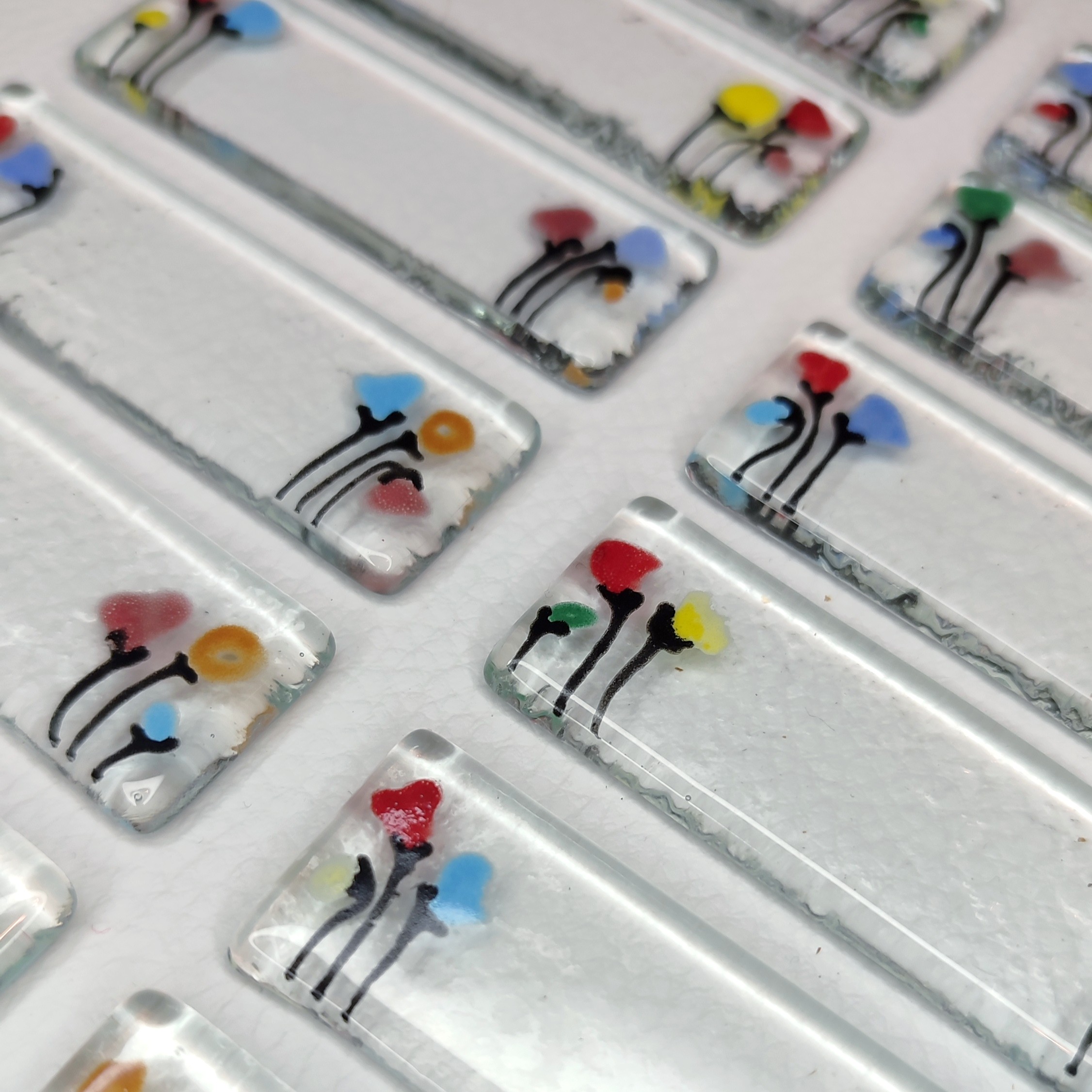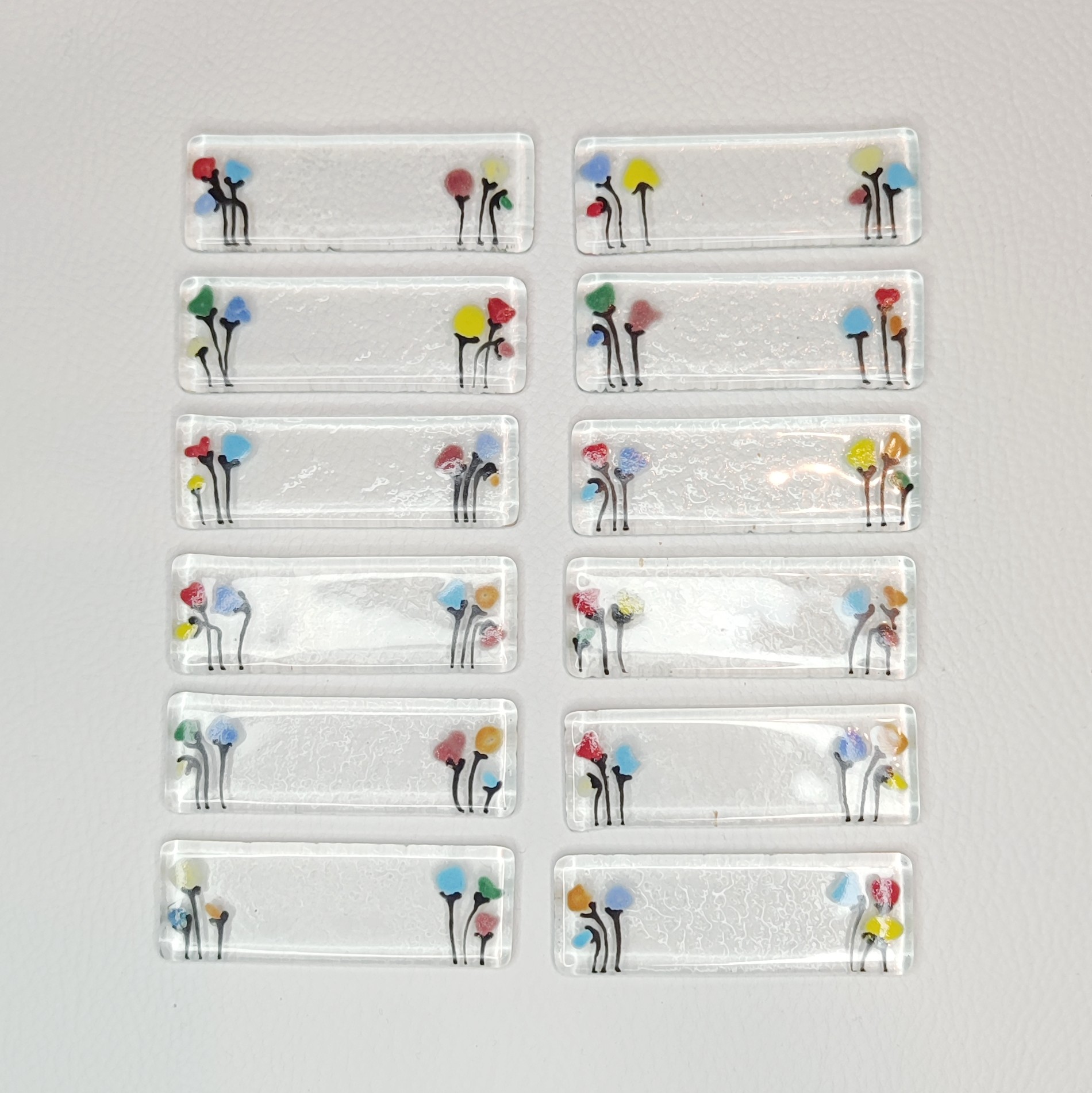 Apportez une touche d’originalité et d’élégance à votre table avec ces porte-couteaux en verre artisanal transparent, décorés de petits bouquets de fleurs multicolores intégrés dans le verre. Réalisés à la main, ils incarnent un savoir-faire artisanal unique et une décoration de table raffinée.