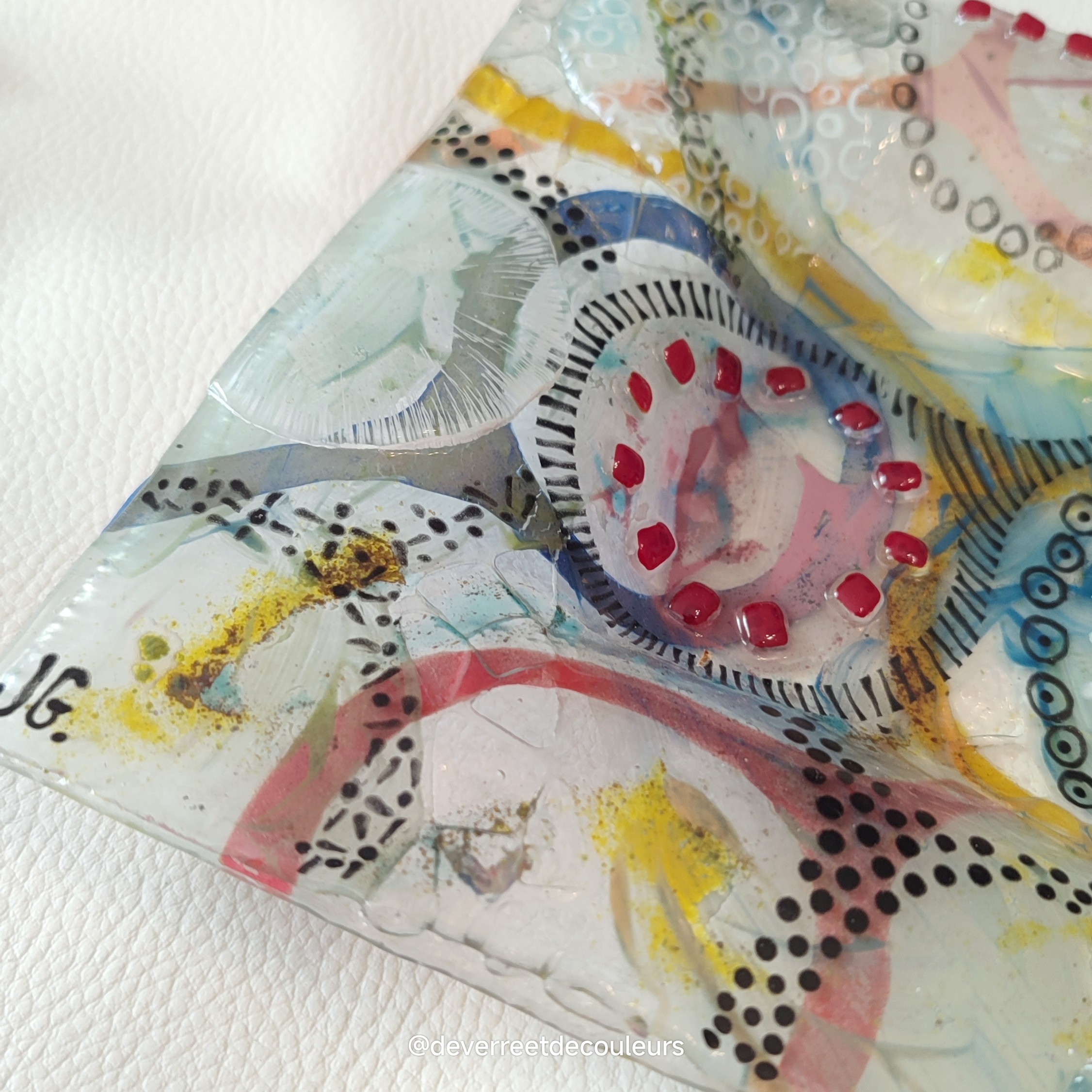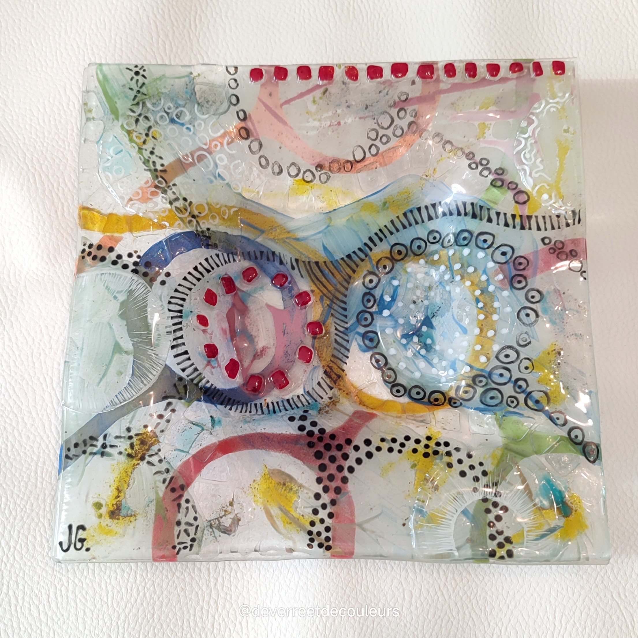 Ce plat a été réalisé de manière artisanale, c'est une pièce unique. Il est composé de différentes "feuilles de verre" qui ont été assemblées et fusionnées ensemble. Chaque feuille de verre a été réalisée séparément et fusionnée ensuite ensemble pour réaliser ce plat carré unique.
