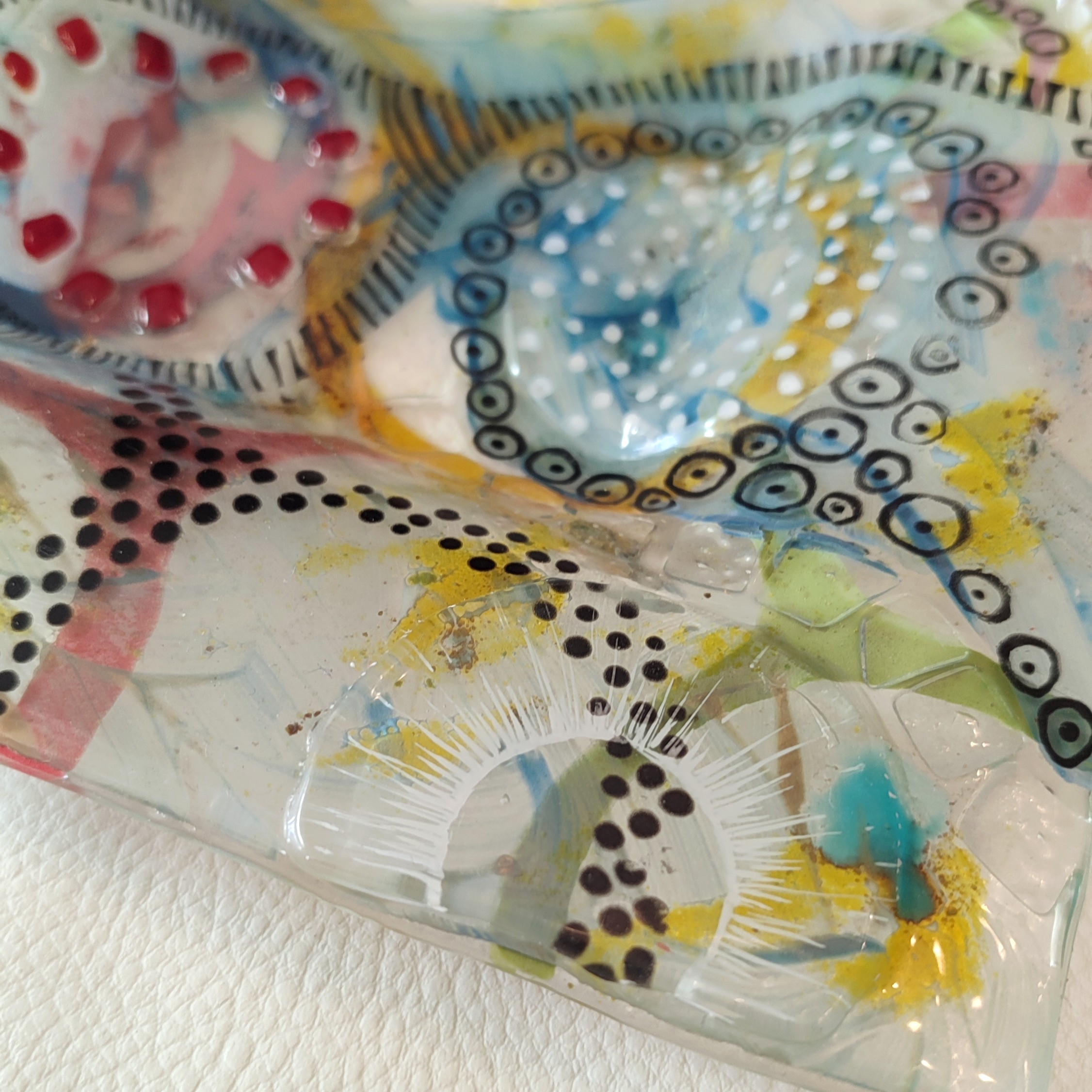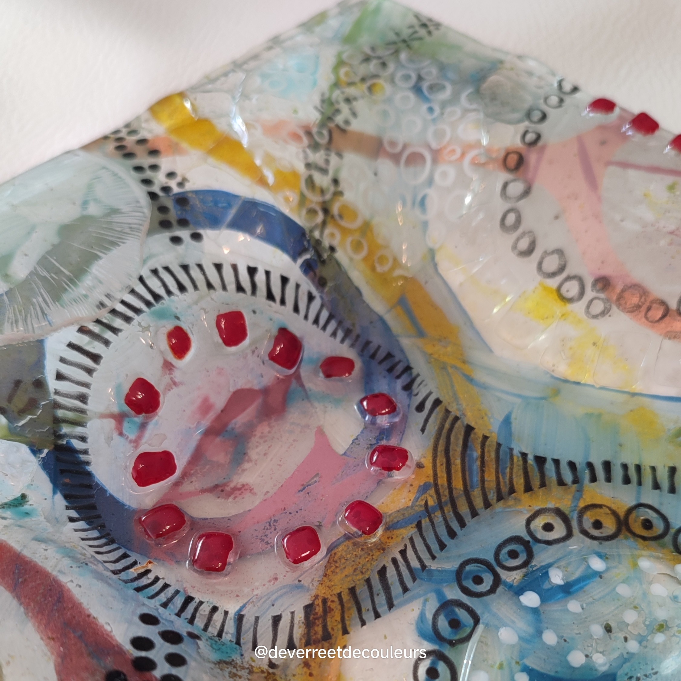 J'ai utilisé différentes techniques et beaucoup d'imagination pour le réaliser, il a des surépaisseurs. Vous trouverez sur ma boutique différents plats dans le même esprit, bien qu'ils soient tous bien différents.