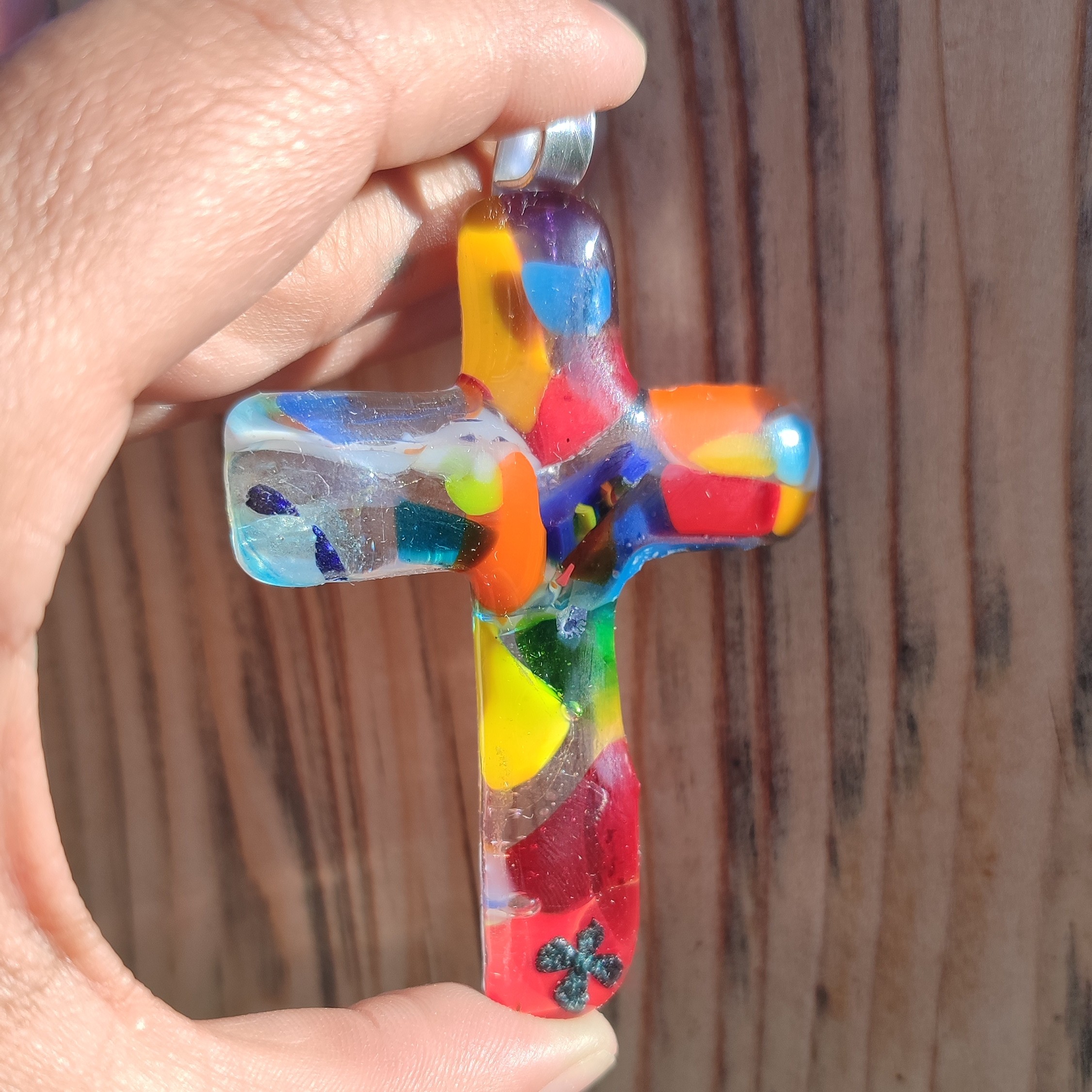 Cette croix est réalisée en verre de manière artisanale, elle est parfaite pour offrir à une communion ou à un baptême ou à un mariage, elle est brillante. Pour la réaliser, j'ai utilisé de nombreuses couleurs et du verre translucide ce qui lui donne de la profondeur et de la luminosité.