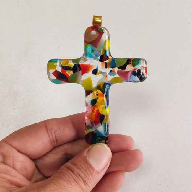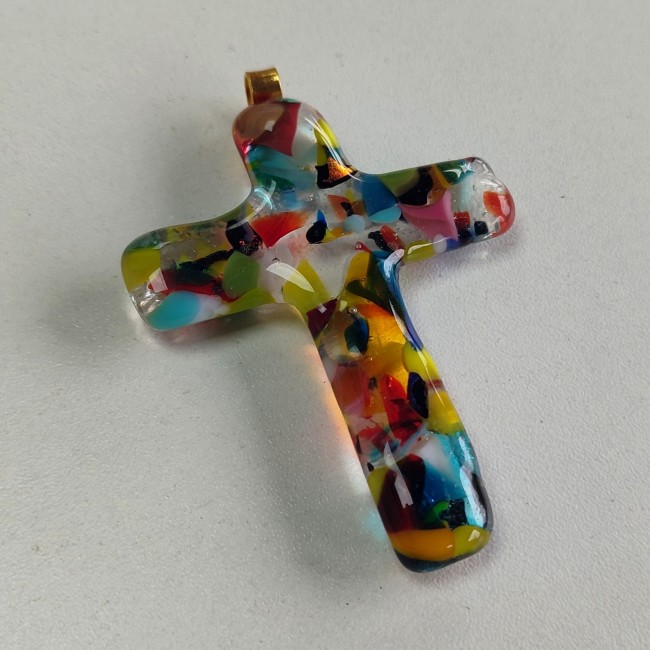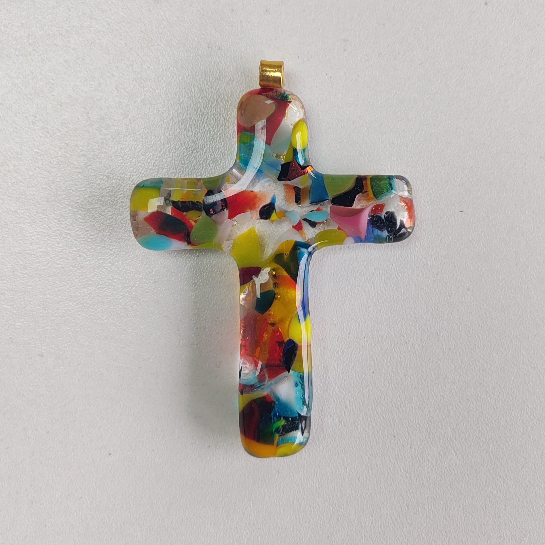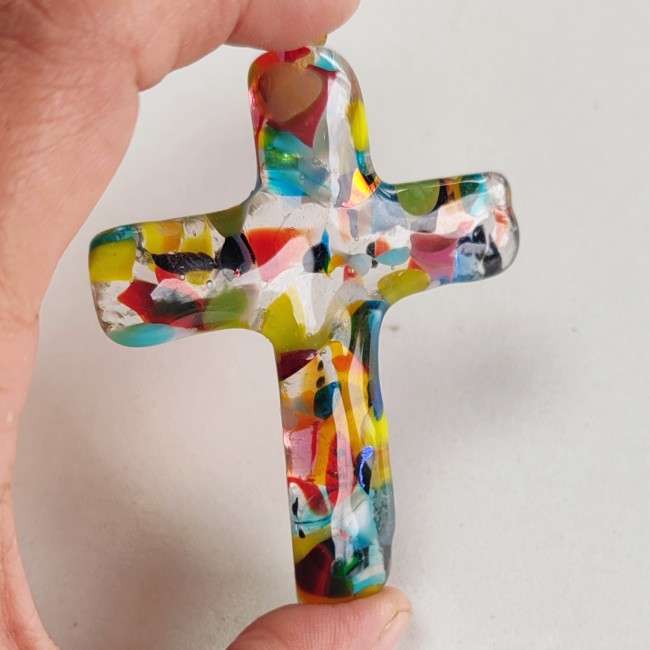 Cette croix est réalisée en verre de manière artisanale. Elle est transparente avec des petits bouts comme des confettis long, il y a différentes couleurs comme du vert anis, du bleu très clair, du bordeaux, du orange...