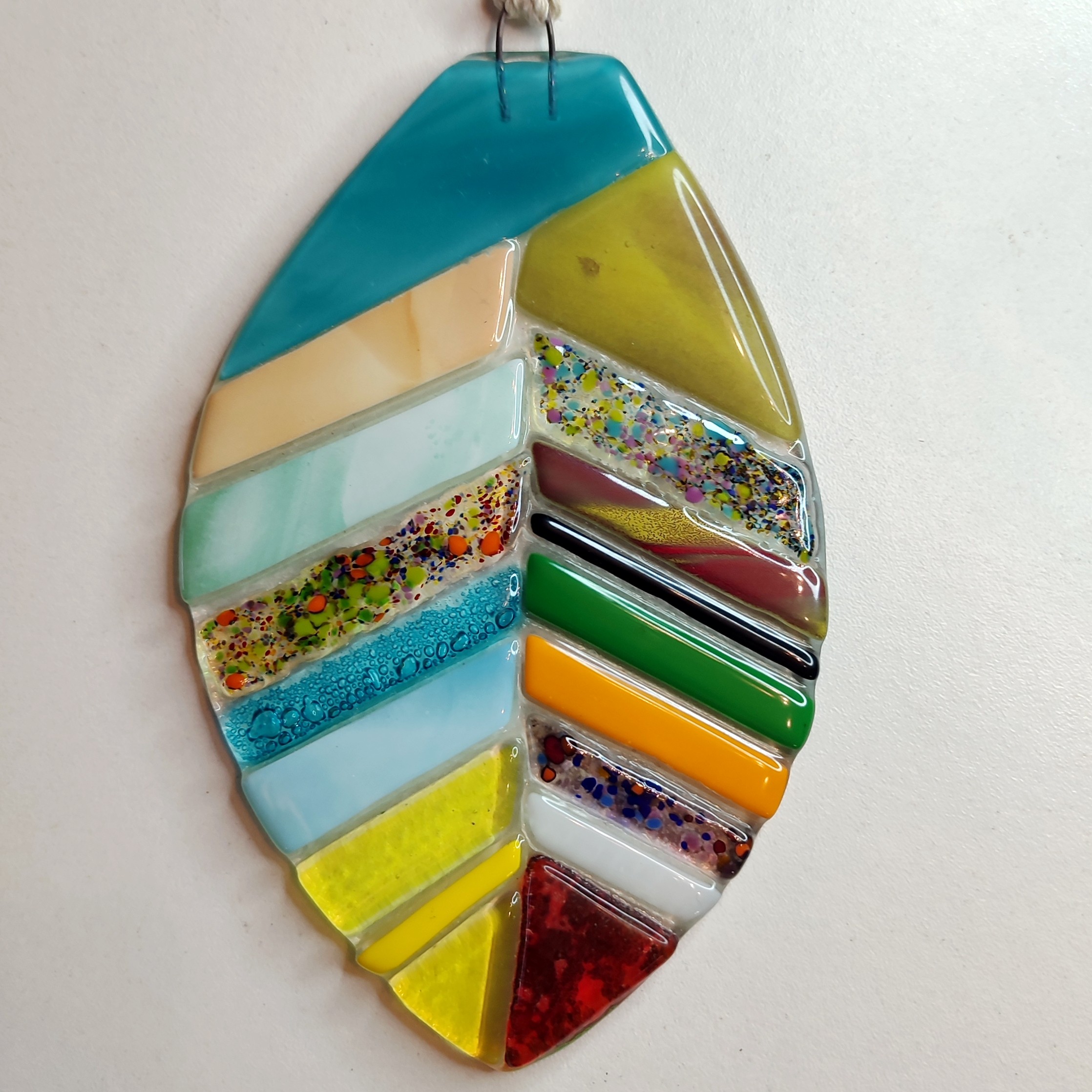 Cet attrape-soleil est un produit unique, réalisé en forme de feuille, il est multicolore.