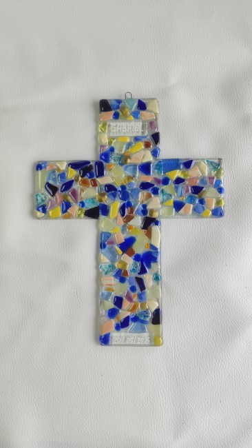 Grande croix multicolore artisanale en verre